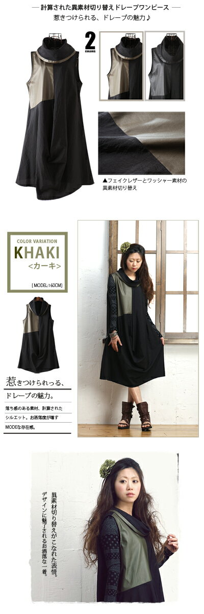 ◆サイズ:肩幅 39.5cm、裾幅:約71cm、 胸囲:約100cm、着丈 (前)97cm (後)103cm、タートル高さ:約20cm、 タートル幅:約40cm ◆カラー:2色:カーキ、ブラック ◆素材:ポリエステル100%仕様 この商品の特徴は? 計算された異素材切り替えドレープワンピース 惹きつけられる、ドレープの魅力♪
