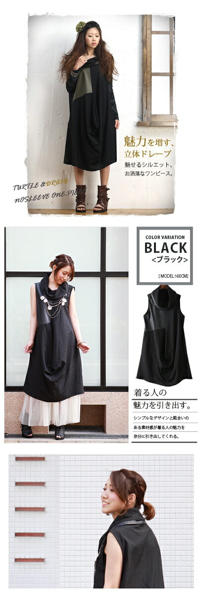 異素材 切り替え ドレープ ワンピース 変形 バイカラー ノースリーブ タートルネック コクーン レディース