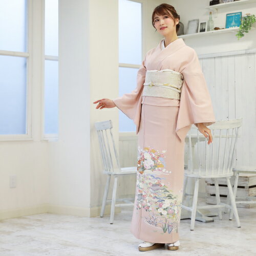 華やかな色使いと流れるように描かれた柄が上品で可愛らしい雰囲気の一着です。